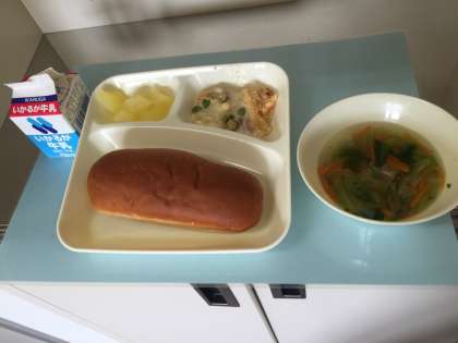 今日の給食は、黒糖パン、牛乳、マカロニグラタン、レタスのスープ、りんご(缶)です。