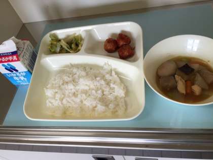 今日の給食は、ごはん、牛乳、まぐろのオーロラ煮、さといもと野菜の含め煮、キャベツの梅風味です。