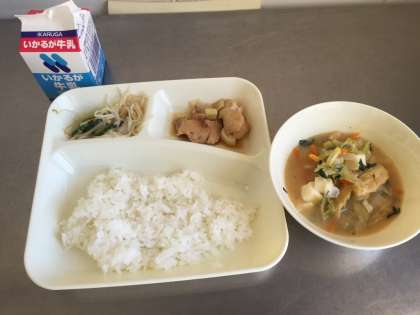 今日の給食は、ごはん、牛乳、やきとり、みそ汁、きゅうりともやしのゆずの香あえです。