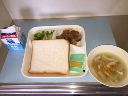 今日の給食は、食パン、牛乳、豚肉のデミグラスソース、スープ、キャベツとピーマンのソテー、りんごジャムです。