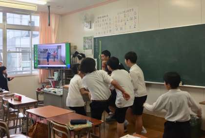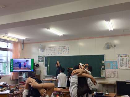 今日は、雨天の為、PEタイムは各教室で、「パオパオダンス」をしました。
