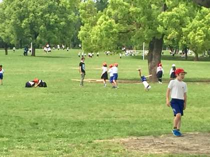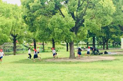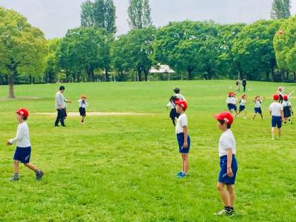 広い芝生で側転をしている子もいて、先生達も子ども達と一緒に走り回っています。