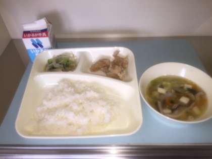 4月27日の給食は、ごはん、牛乳、鶏肉のからあげ、中華スープ、チンゲンサイともやしの甘酢あえでした。