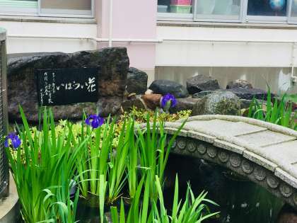 学校の中庭にある池の「カキツバタ」が、見事に開花しました。