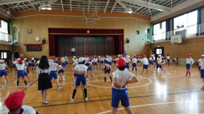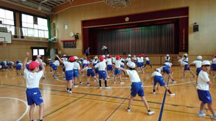 今日は運動場が使えないので、各教室でストレッチをしました。3時間目に体育をする3・4年生は、体育館で、ストレッチとラジオ体操をしました。