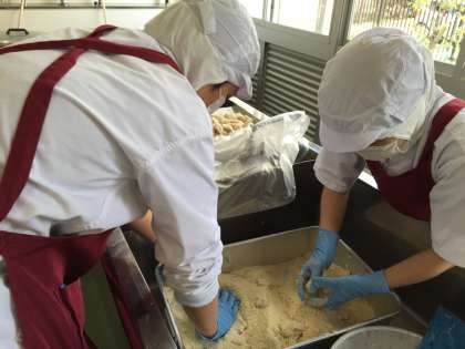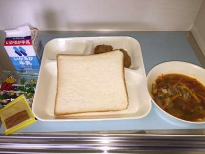 今日の給食は、食パン、アプリコットジャム、牛乳、一口トンカツ、ミネストローネです。