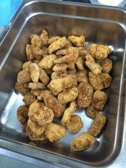 豚肉はワイン、塩、オールスパイスで下味をつけてから衣をつけて揚げました。