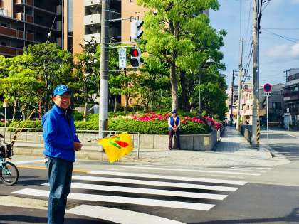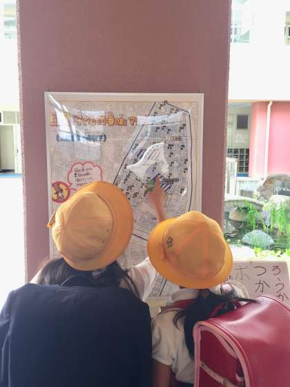 子どもたちが安全に登下校できるように、子ども見守り隊の方が見守ってくださっています。子どもが確認しているのは、「子ども110番の家」マップです。