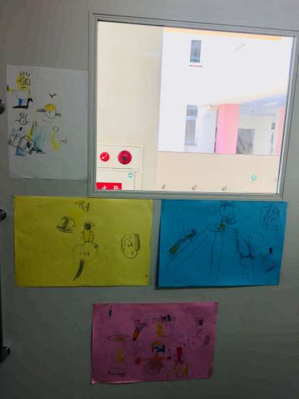 今日の1時間めに、なかよし集会をしました。逆さまに絵を描くのが得意な児童がいます。なかよし学級では、児童の作品を大切に掲示しています。