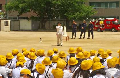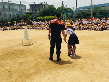 今日は、火災からの避難訓練を行いました。大正消防署の消防士さんから、「避難するときに気をつけること」や「消火器」の使い方を教えていただきました。その後、6年生16人が実際に水消火器を使い、1年生と2年生は消防車の見学をしました。