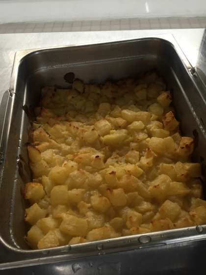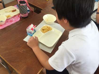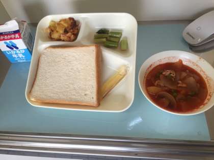 今日の給食は、食パン、はちみつ、牛乳、ケチャップ煮、グリーンアスパラガスのサラダ、りんごのクラフティです。