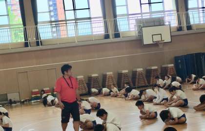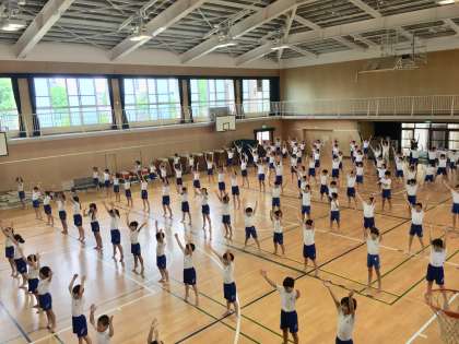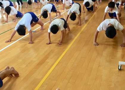 運動会の組み立て体操の練習前に、ラジオ体操や柔軟体操、腕立て伏せを行っています。ケガの予防対策として、準備運動は大切です。