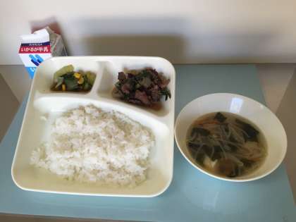 今日の給食は、ごはん、牛乳、プルコギ、とうふのスープ、チンゲンサイとコーンの甘酢あえです。