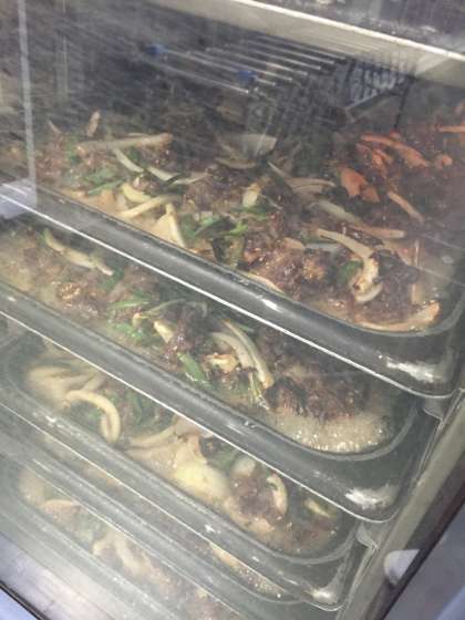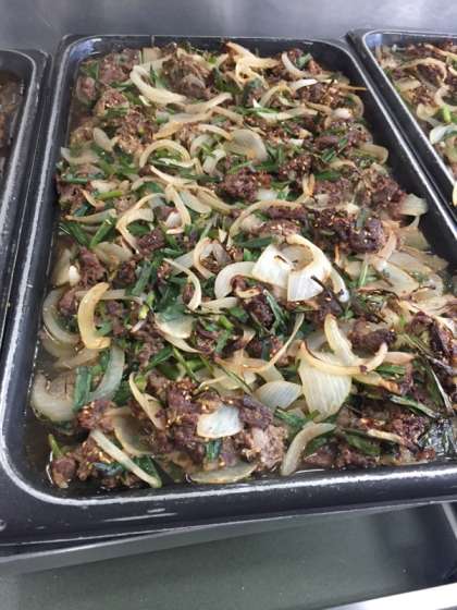 牛肉とたまねぎ、にらをコチュジャンなどの調理液で下味をつけ、焼き物機で焼きました。