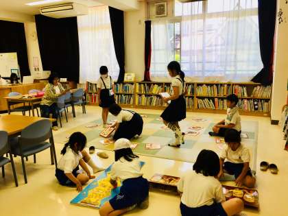 本校では、PTAの図書館ボランティアさんと図書委員会さんが毎日お昼休みに図書館開放を行なっています。今日は、PTAの図書館ボランティアさんがカルタの読み上げをしてくださいました。