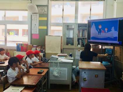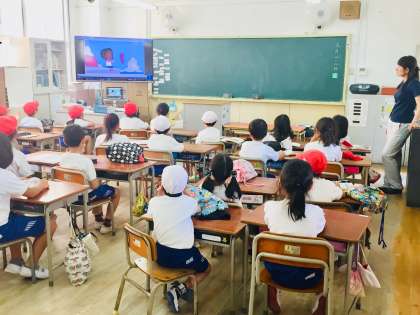 今日のEnglish Timeは、英語を感じ取ろうとする姿勢を育むことがねらいでした。2年1組は、体育の授業前の5分間でしたが、子どもたちは耳をすまして聞いた英語を上手に発音していました。Eat an apple.