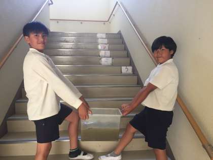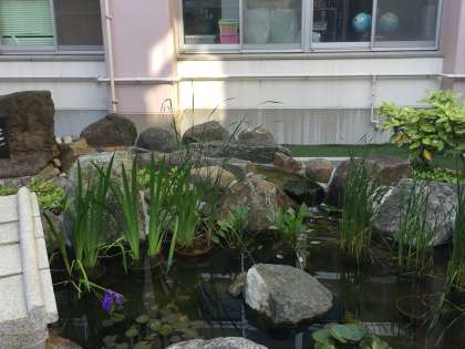 中庭の池で見つけたヤゴを教室で飼育するようです。嬉しそうです。中庭でヤゴを採るのは、これが最後です。