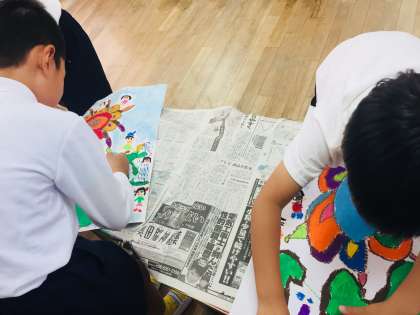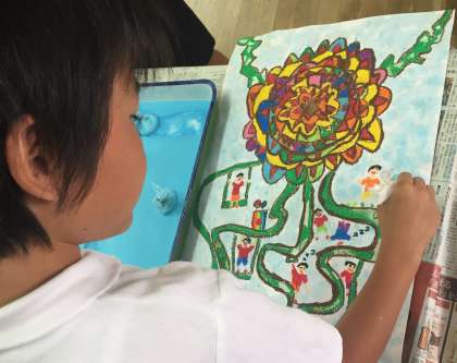 2年3組では、図工の時間に「ふしぎな花」の制作をしています。クレパスで花を描いた後、背景をスポンジを使って塗っています。