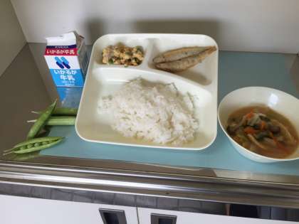 今日の給食は、ごはん、牛乳、きびなごのてんぷら、みそ汁、えんどうの卵とじです。
