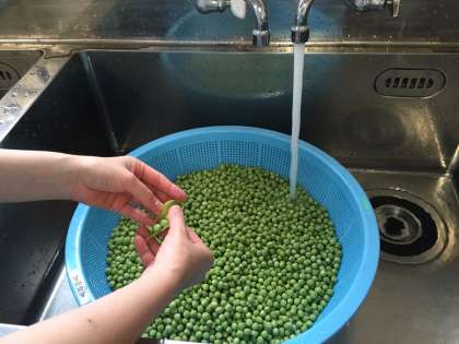 今日の「えんどうの卵とじ」は、450人分のえんどうを調理員さん4人で30分かけてさやから豆を取り出して作ってくださいました。