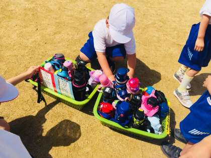 熱中症予防のため、水分補給をしっかりしています。水筒を必ず持ってくるようにしましょう。
