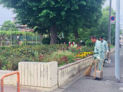 毎朝、管理作業員さんが校門付近や隣接している三軒家東公園前(通学路)の環境整備をしてくださっています。また、校内の木や花には、プレートをつけています。名前をおぼえていきましょう。