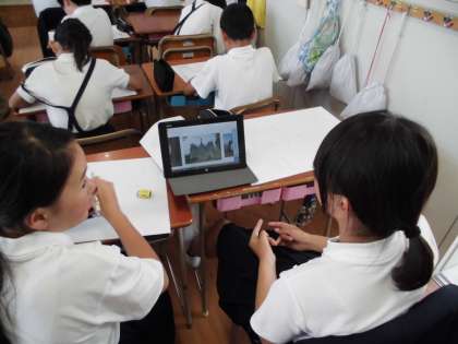 児童はタブレットを活用して「お城」を検索し、いろいろなお城を見て、イメージを膨らませながらかいています。