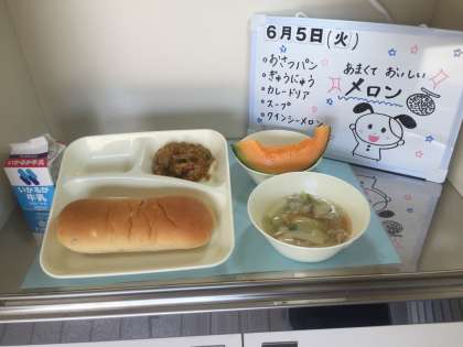 今日の給食は、おさつパン、牛乳、カレードリア、スープ、クインシーメロンです。