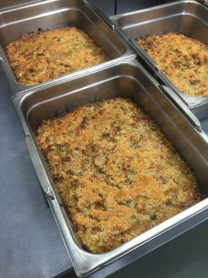 カレードリアは、鶏肉、玉ねぎをいため、米と合わせて煮たあと、ミニバットに入れて焼き物機で焼きました。