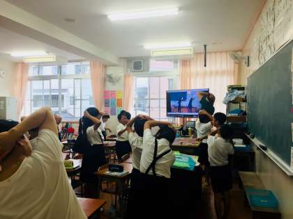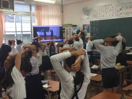 今日から、雨の日はPEタイムで「姿勢体操」をします。大型テレビを見ながら、大きく体操をしていました。テレビで模範体操をしているのは、本校教職員です。校長先生も一緒に姿勢体操をされていました。