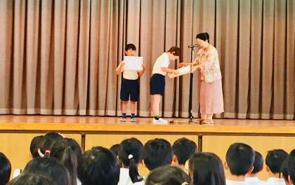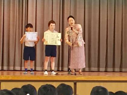 今日、校長先生から表彰されたのは、入賞の1年 西井さんと準優勝の3年 ビリンガムさんです。