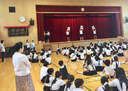 今日の児童集会は、「先生のは声あてクイズ」をしました。児童は、先生の好きなことをよく知っていて、正解する児童が多かったです。