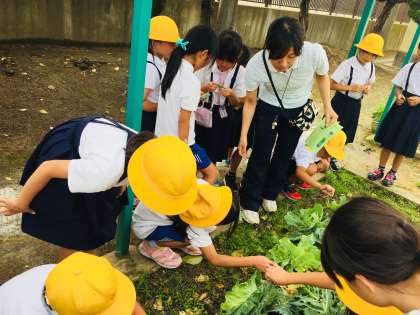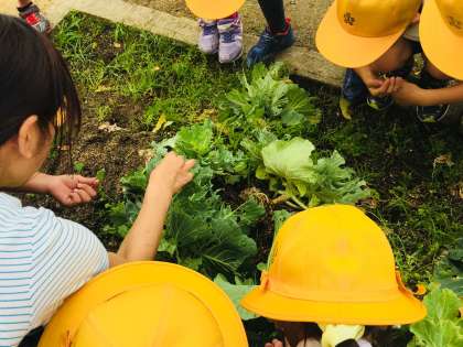 モンシロチョウの卵と幼虫をみつけている様子です。