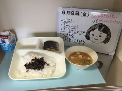 今日の給食は、ごはん、牛乳、さごしの塩焼き、みそ汁、牛ひじきそぼろです。
