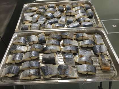 さごしの塩焼きは、料理酒、塩で下味をつけ、更にふり塩をして焼き物機で焼きました。