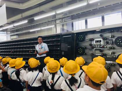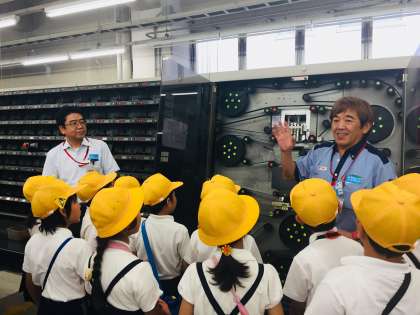 大正郵便局で働いている方に説明をしていただきながら、郵便局の中を見学しています。写真の「書状区分機(しょじょうくぶんき)」は、ハガキの住所を読み取る機械です。大正郵便局では、一日に、約2万5千通配達しているようです。