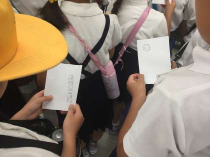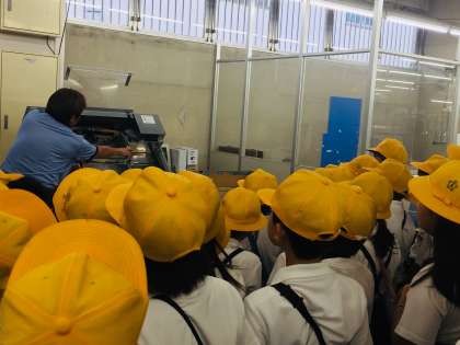 郵便局での見学の様子です。日付印(にっぷいん)をつける機械の動きを見ています。