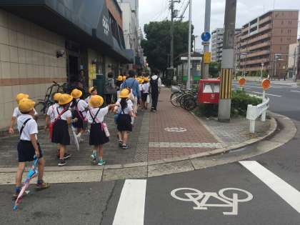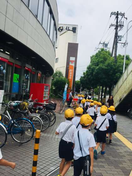 2年 社会見学「まちたんけん」の様子です。大正郵便局を出発した後、郵便ポストを見つけて、とても嬉しそうでした。