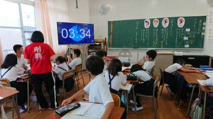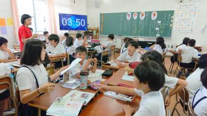 5年 道徳の授業のようすです。班の友だちと意見交流しています。