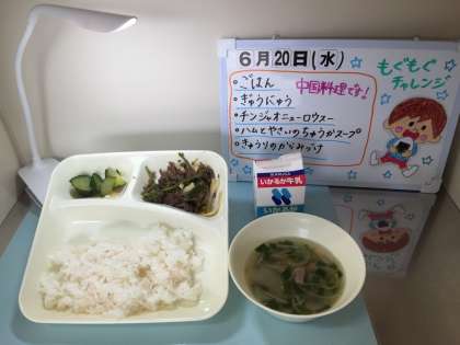 今日の給食は、ごはん、牛乳、チンジャオニューロウスー、ハムと野菜の中華スープです。