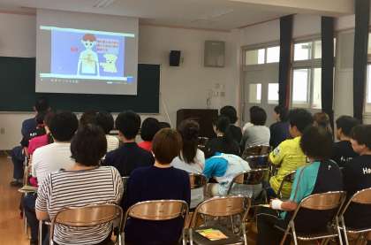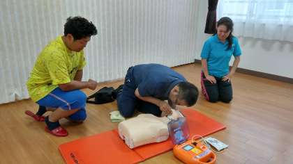 教職員とPTAの方と、普通救命講習を行いました。内容は、「応急手当」の方法(胸骨圧迫・AEDの使い方など)です。