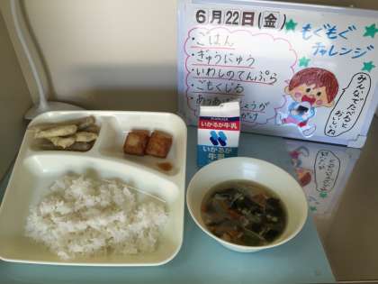 今日の給食は、ごはん、牛乳、いわしのてんぷら、五目汁、あつあげのしょうがじょうゆかけです。