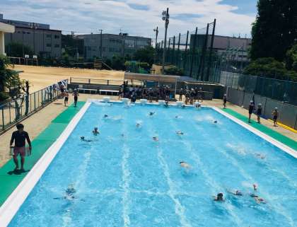 水泳指導 5年生の様子です。25メートルを泳いで、泳力をつけています。