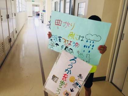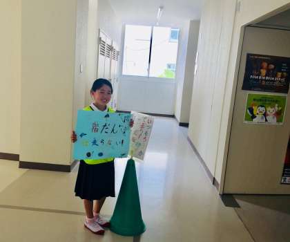 お昼休みに、児童会が「ろうか・かいだんを正しく歩きましょう」と呼びかけていました。