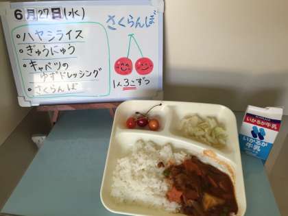 今日の給食は、ハヤシライス、牛乳、キャベツのゆずドレッシング、さくらんぼです。