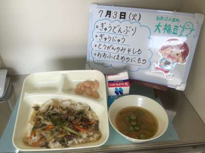 今日の給食は、牛丼、牛乳、とうがんのみそ汁、大福豆の煮物です。