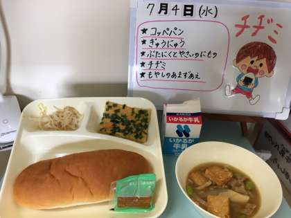 今日の給食は、コッペパン、牛乳、豚肉と野菜の煮物、チヂミ、もやしの甘酢あえです。