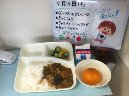 今日の給食は、夏野菜のカレーライス、牛乳、きゅうりとコーンのサラダ、冷凍みかんです。
