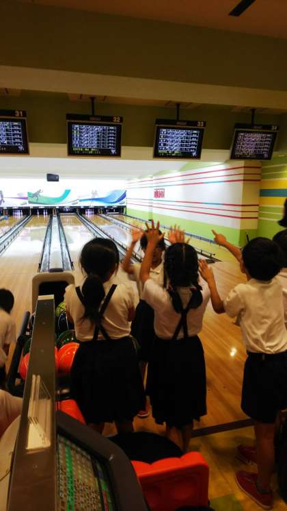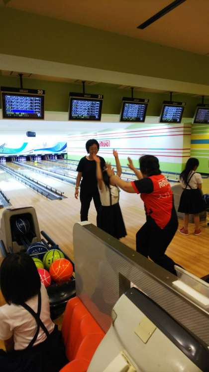 ボーリングをして、盛り上がっています。プロボーラーの方がハイタッチしていただきました。