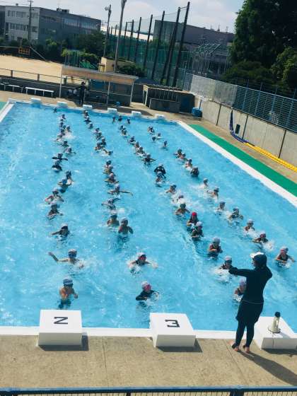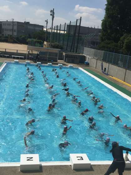 リズムに合わせて、水しぶきを上げて、水慣れをしています。熱中症予防のために、毎日、水筒を持参させてください。